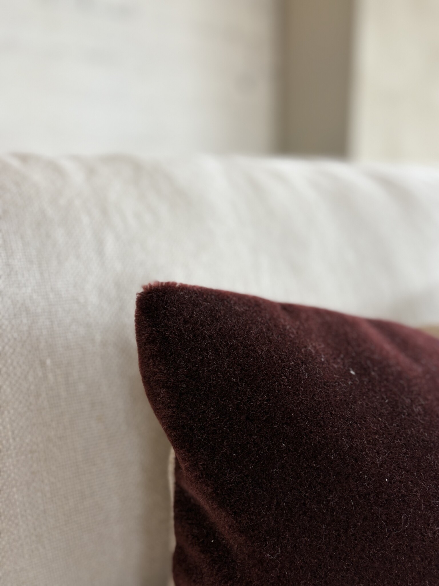 This decorative cushion is available in three rich mohair colors: light gray, gray-green, and aubergine. The cushion cover measures 50x30cm and features a tone-on-tone concealed zipper. The Amy decorative cushion cover does not include an inner cushion. Would you prefer a cushion cover with filling? That's possible: we sell matching feather inner cushions with all our cushion covers.